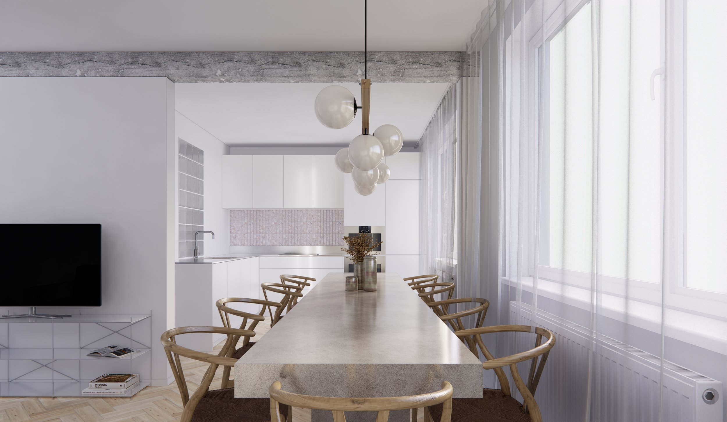 Vzniká vzdušný priestor s masívnym, dlhým stolom - centrom celého bytu.