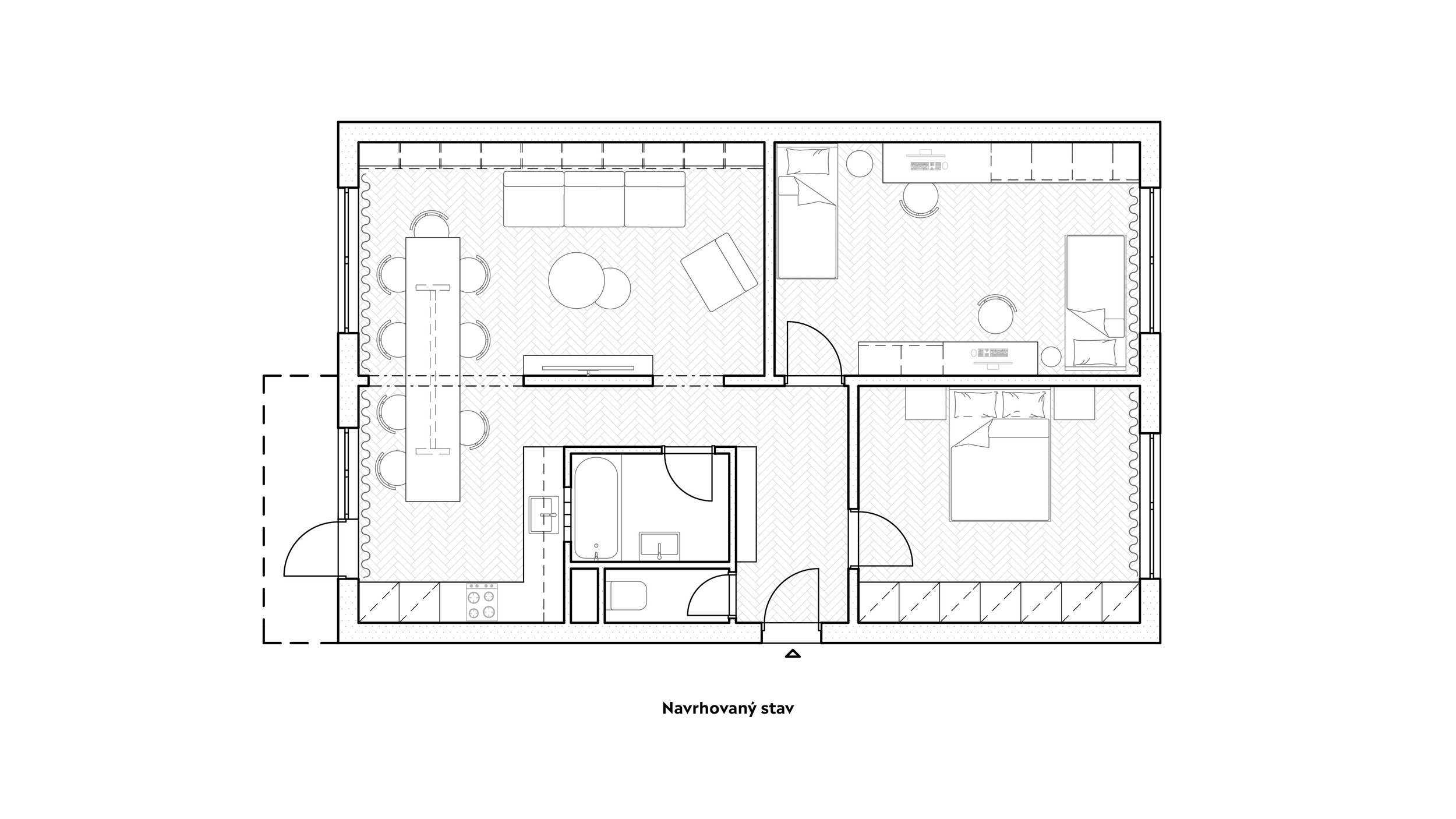Návrh bytu v typickom panelovom dome z 80. rokov. Kuchyňu a obývaciu izbu dispozične prepájame rozšírením otvoru v mieste pôvodných, zamurovaných dverí.